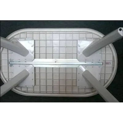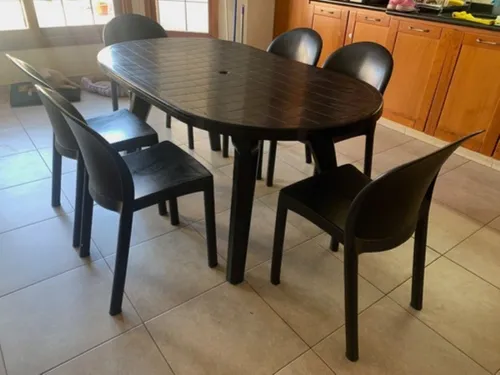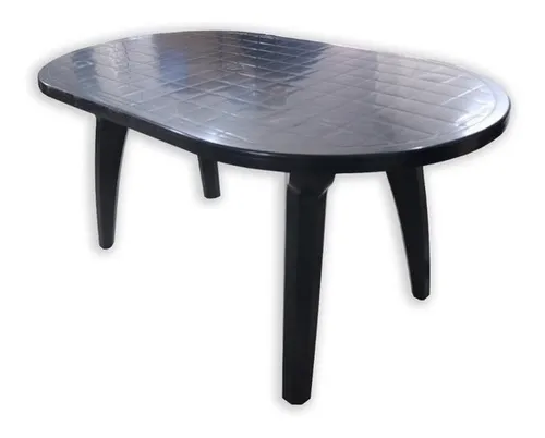 -CARACTERISTICAS DE LA MESA: Fabricada en resina sintetica de alta densidad e impacto, super reforzada ya que lleva 10 tornillos phillips en cada pata que le dan mayor firmeza y estabilidad, ademas de contar un alma o refuerzo de acero en su linea media que evita que la misma se deforme por accion del sol o del calor. Cuenta con 2 regatones de goma en cada pata para darle mayor adherencia en cualquier tipo de superficie, posee aguero para sombrilla y adaptador para la misma.