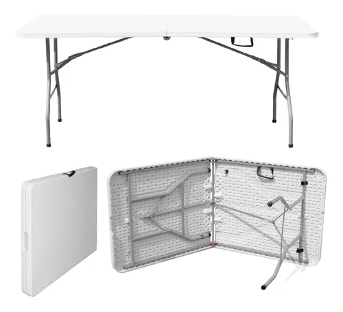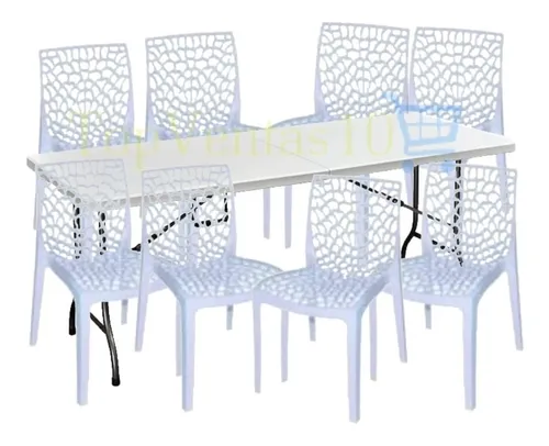 MESA RECTANGULAR REFORZADA BLANCA TIPO VALIJA PLEGABLE + 8 SILLAS PERLA REFORZADAS BLANCAS.